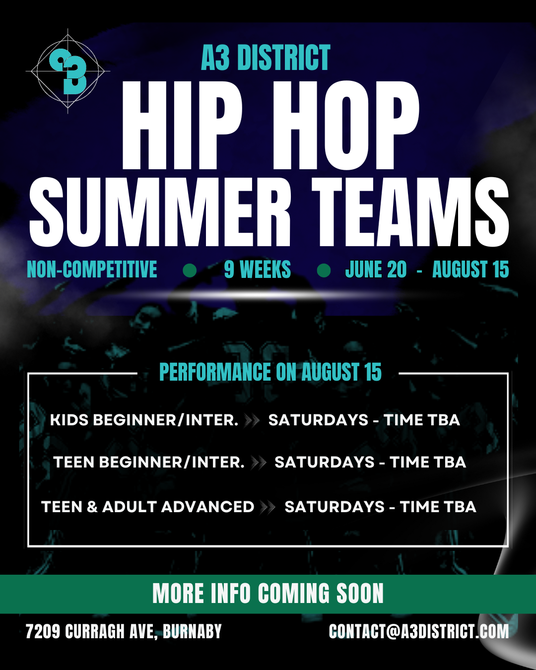 Want to keep your training up through the summer? Or see how we get down at A3 and train with our coaches through the summer? This is a perfect taste of how our teams run, plus a non-competitive program to keep you dancing through the summer and finishing it off with a fun performance. This is a choreography based program. Summer Team runs for 9 consecutive weeks with ONE rehearsal per week to learn a routine & a PERFORMANCE on the final week.